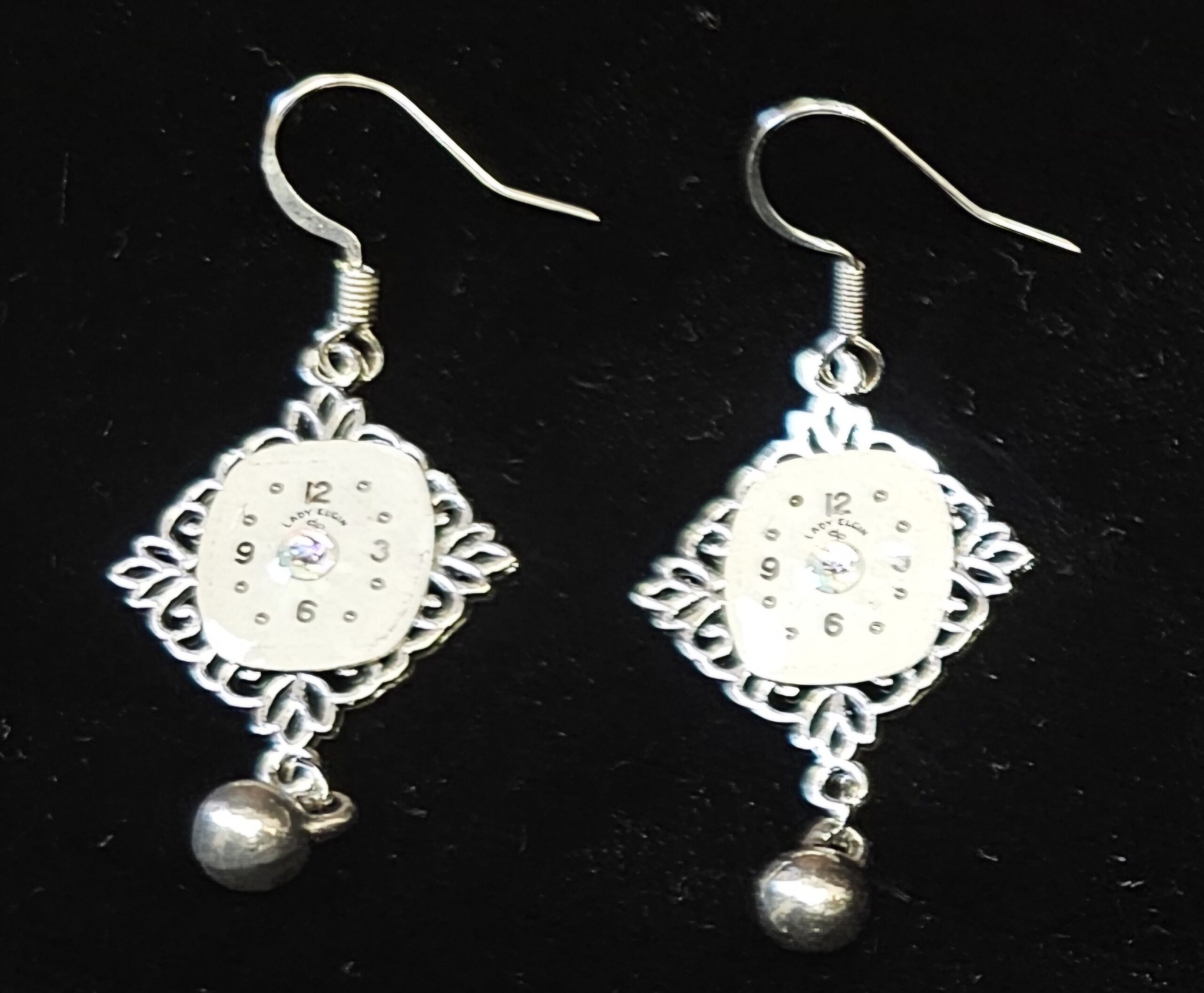 Earrings Lady Elgin Watch face Silver tone 1″ square with drop ball, pierced fish hook style