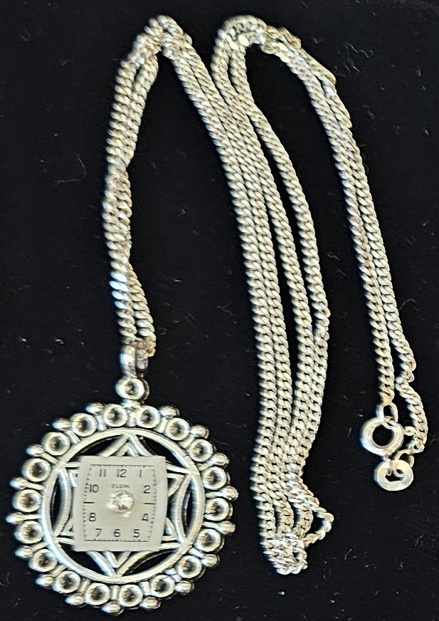 Necklace, silver tone 1 1/4″ round with square watch face, 24″ chain, spring ring clasp