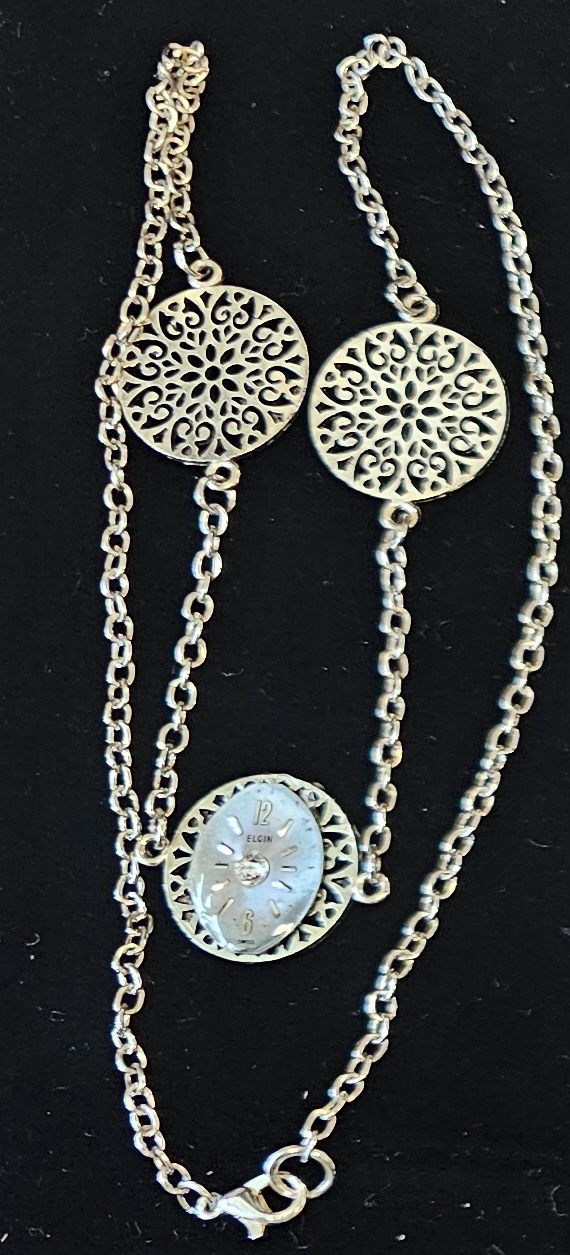 Necklace, silver tone 3/4″ round three medallion with round watch face, 16″ chain, lobster clasp